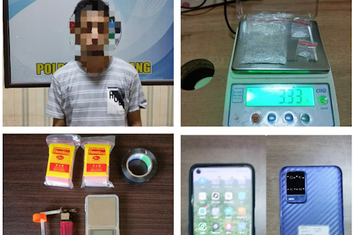 Setelah mengamankan tersangka, Polisi mendapatkan beberapa barang bukti diantaranya, satu bungkus plastik klip bening yang berisikan narkotika jenis sabu dan dua bungkus plastik klip bening yang berisikan narkotika jenis sabu yang dibalut dengan menggunakan tissue kemudian di lakban berwarna hitam dengan berat 3.33 gram.